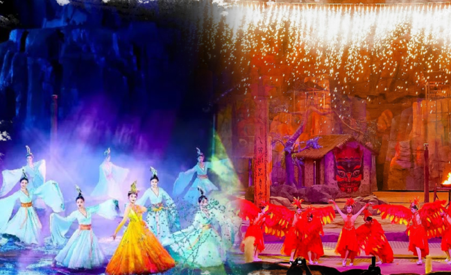 大型水舞光影体验剧《水秀》/大型火舞光影体验剧《火秀》:借取自然景观,真山真水真火焰,设有3000座;场景开阔,气势磅礴。