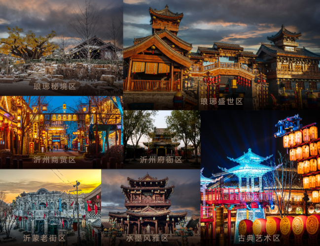 琅琊秘境区、琅琊盛世区、沂州商贸区、古典艺术区、沂州府衙区、沂蒙老街区、水墨风雅区,七大街区一步一景,为游客带来沉浸式的琅琊风情体验。